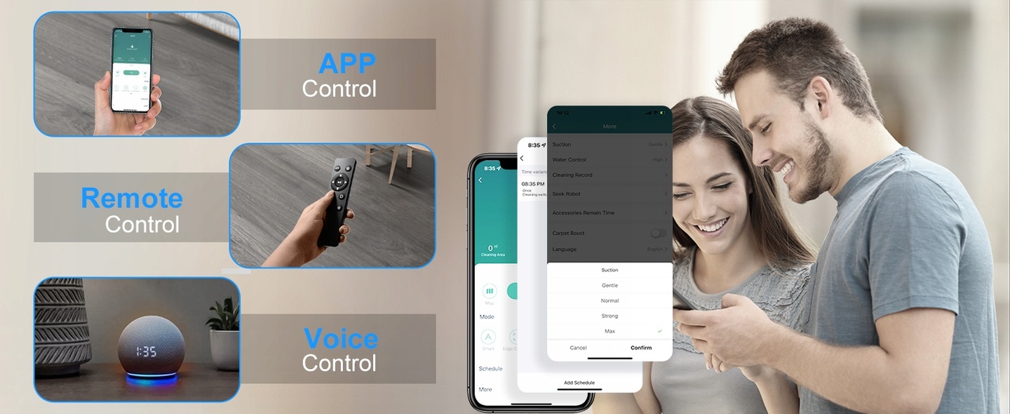 - Sterowanie na wyciągnięcie ręki: Zarządzaj robotem za pomocą intuicyjnej aplikacji Tuya Smart na swoim smartfonie, pilota dołączonego do zestawu lub komendami głosowymi za pośrednictwem Amazon Alexa i Google Home. Planuj harmonogramy sprzątania, wybieraj tryby czyszczenia i monitoruj jego pracę zdalnie.